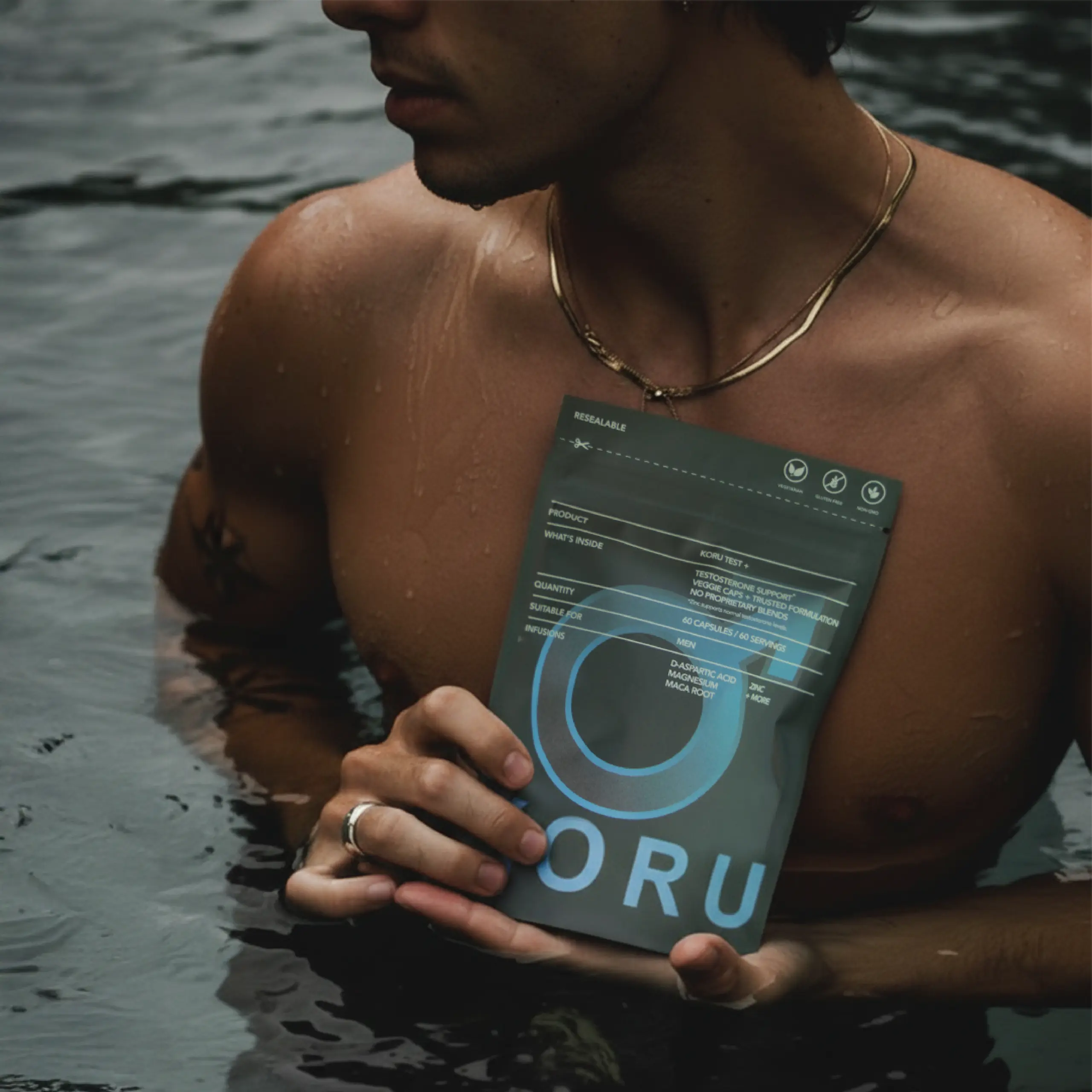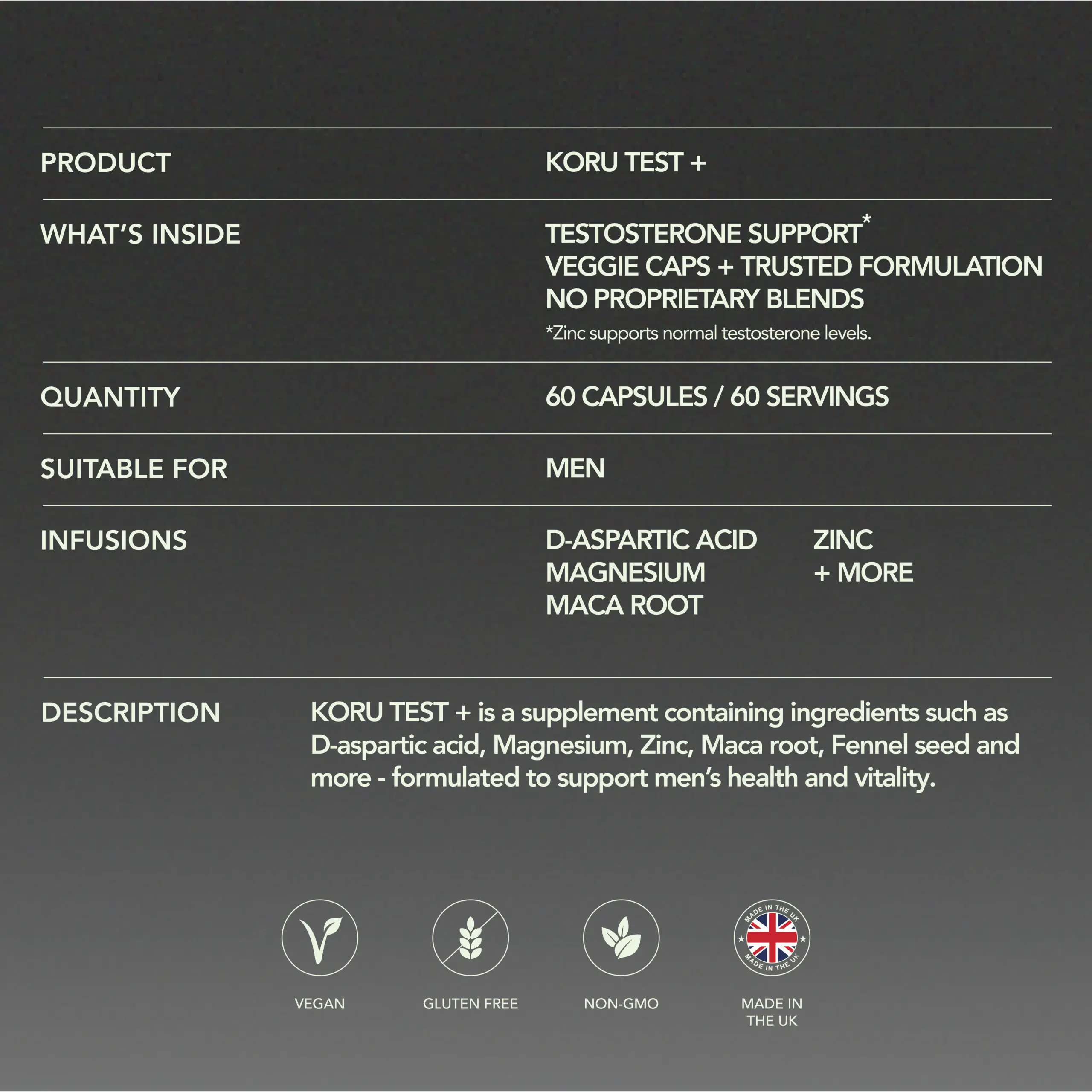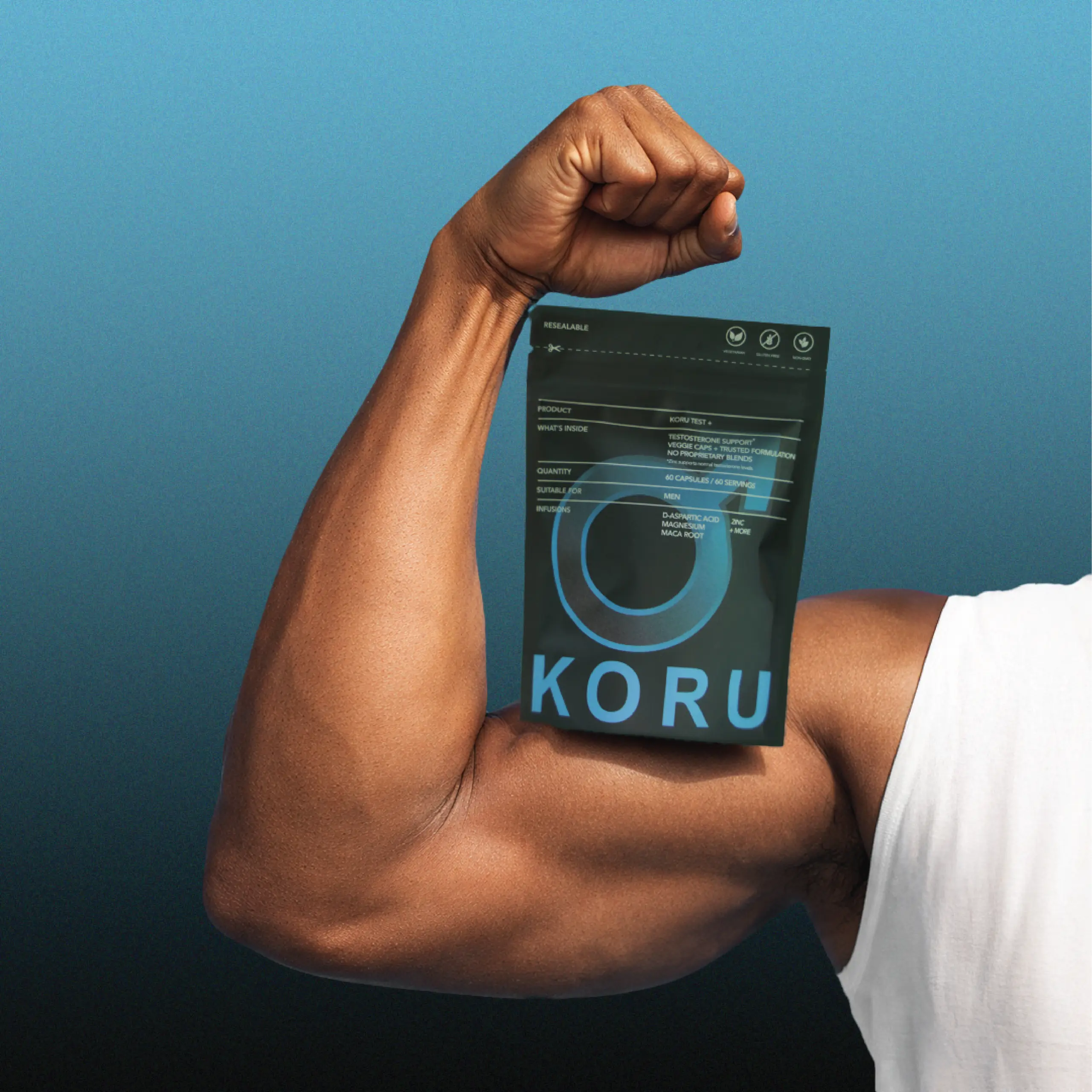 KORU TEST + is a supplement containing ingredients such as D-aspartic acid, Magnesium, Zinc, Maca root, Fennel seed and more – formulated to support men’s health and vitality.
